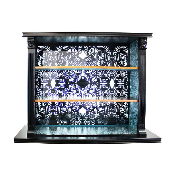 The starting point, the woodwork is reclaimed from an antique cabinet, about 75% of the wood was removed, and partly replaced with an Organic Steel panel combined with a smokey glass plate. This adapts the design to a contemporary vision, allowing the light to enter and bring the design to life, the shadows cast a playful melody throughout the day.